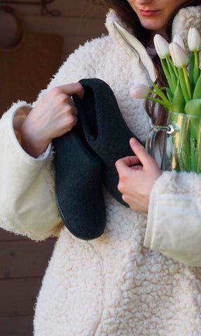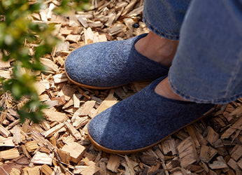 Unsere Hausschuhe bestehen aus 100% reiner, natürlicher Wolle in Denim mit einer Sohle aus FSC®-zertifiziertem Gummi. €90,00