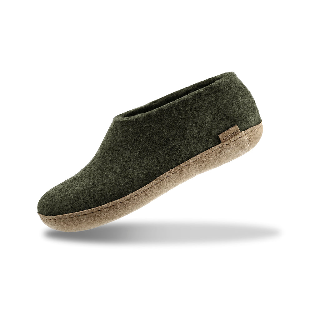 Filzschuh aus 100% reiner Naturwolle in der klassischen Farbe Forest mit einer Sohle aus weichem Kalbsleder.