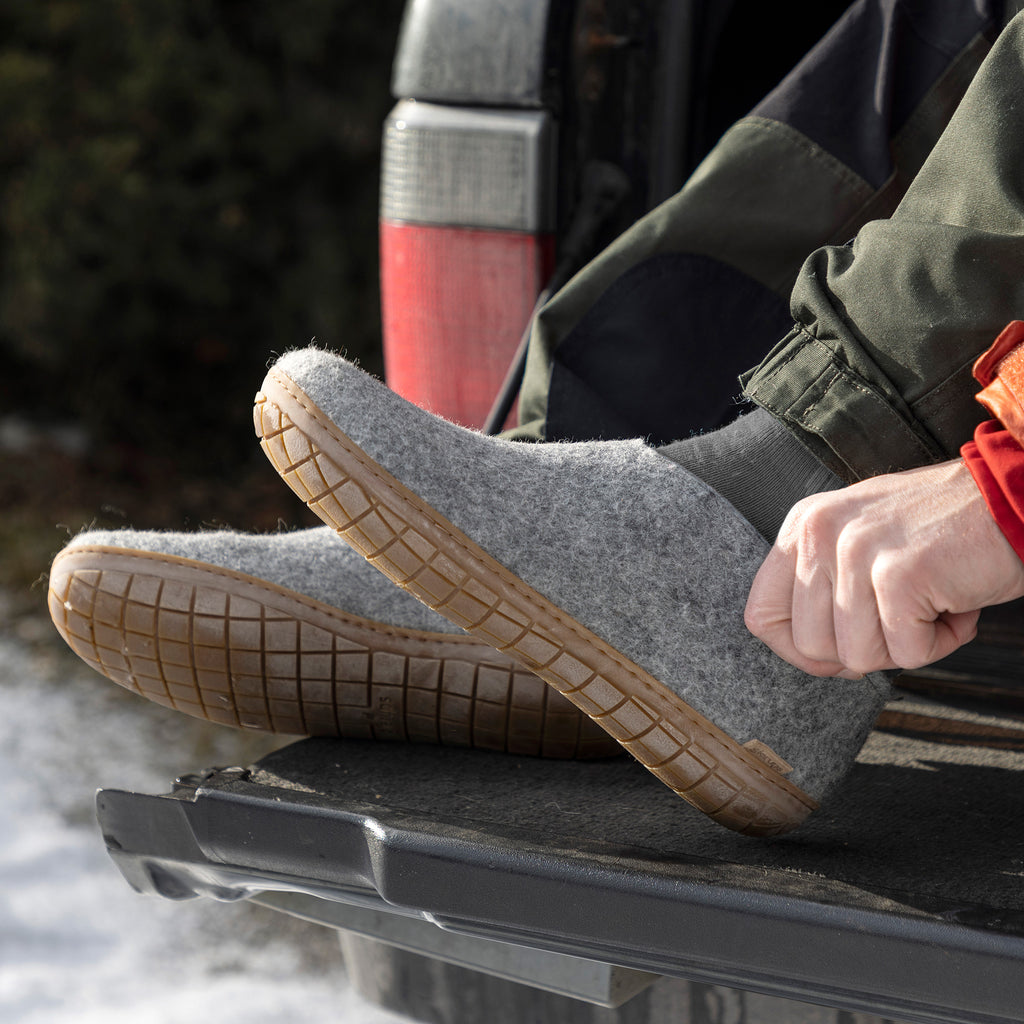Filzschuh aus 100% reiner Naturwolle in der klassischen Farbe Grau mit einer Sohle aus aus Naturkautschuk.